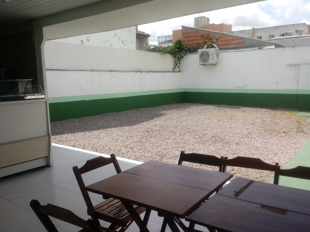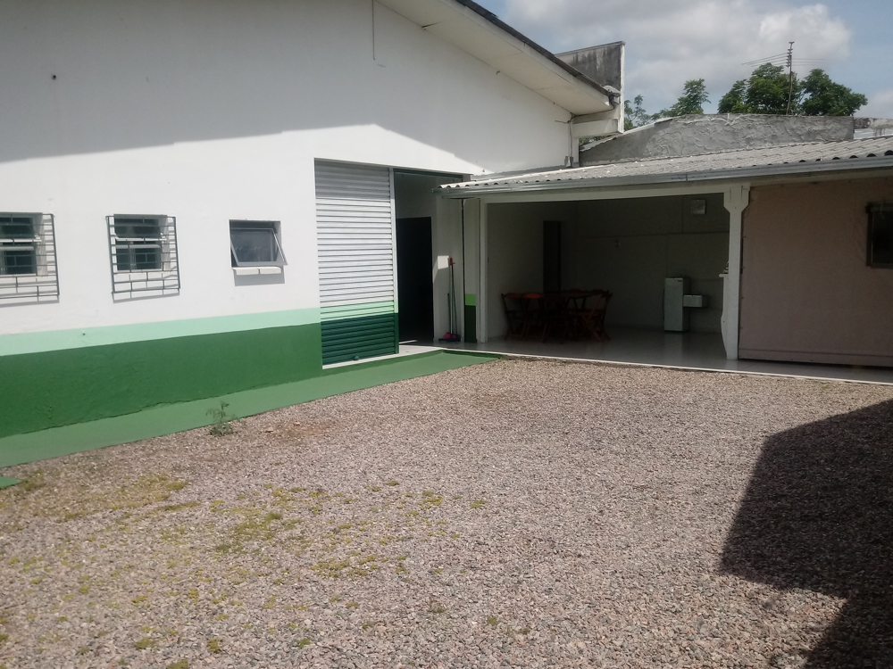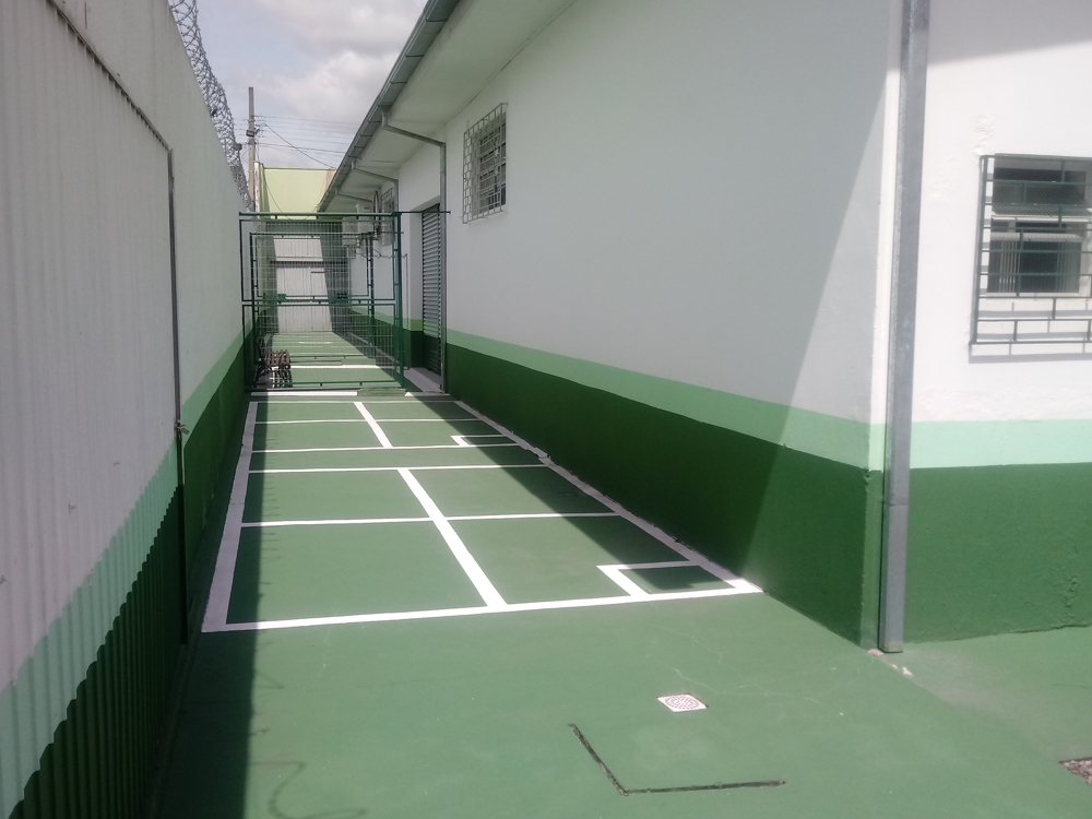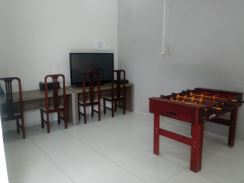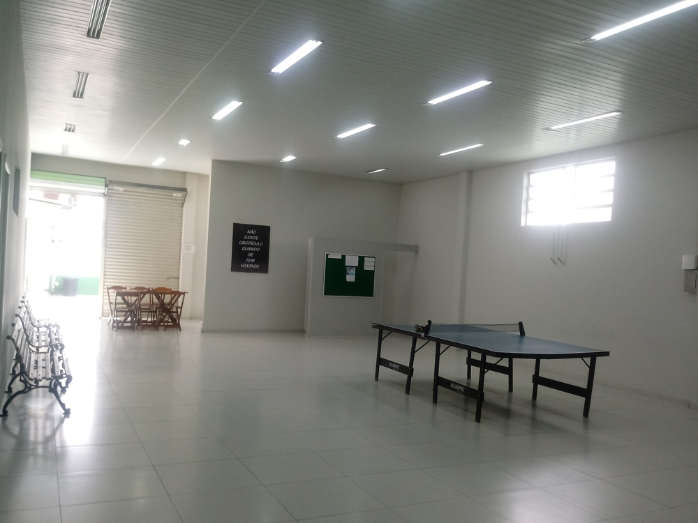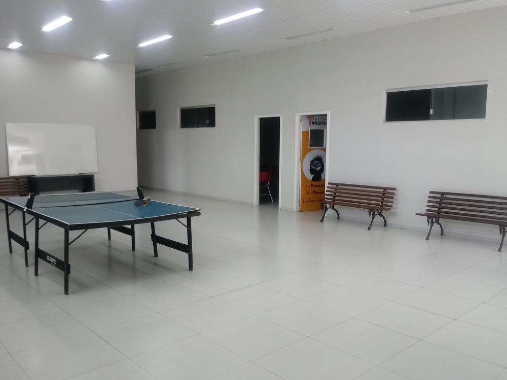 Amplo pátio coberto para o intervalo dos alunos, com atividades como ping-pong e pebolim que permitem maior interação entre os alunos e professores